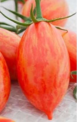 SOI DEOSEBIT, SUPERB, DE TOMATE LUNGI DE 4 -6 cm , CU O CULOARE GALBENĂ, COMBINATĂ CU DUNGI ROȘII-PORTOCALII.