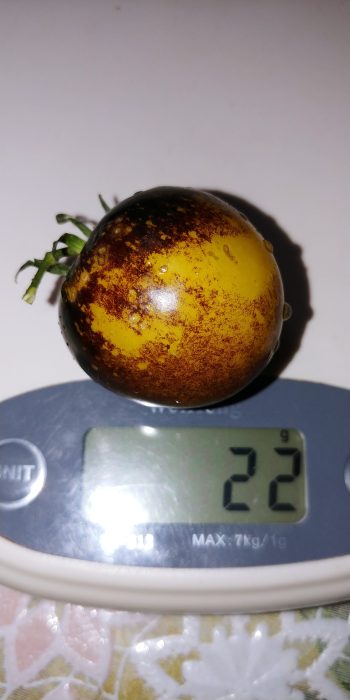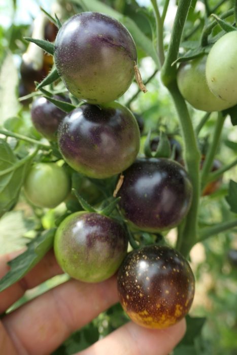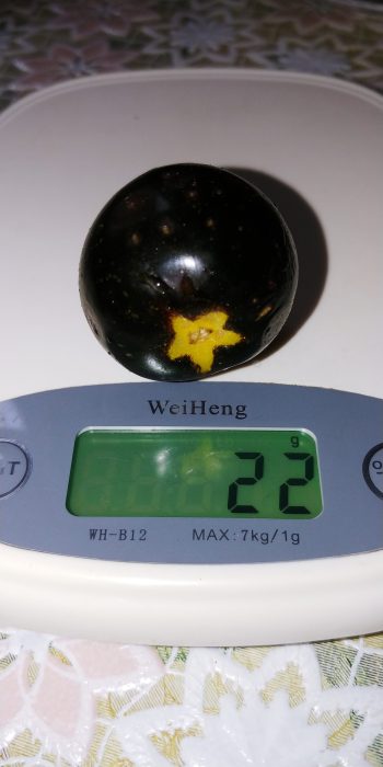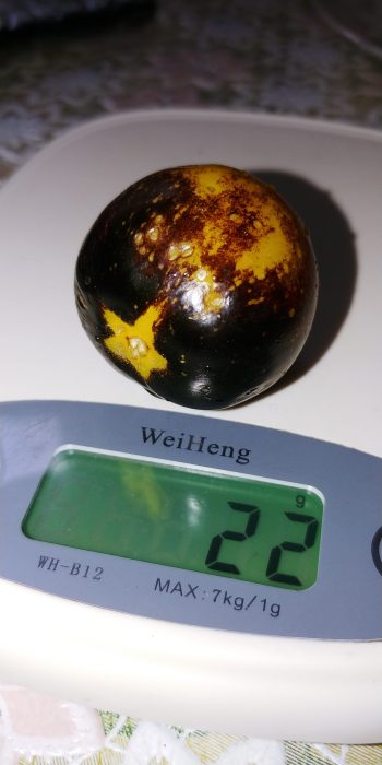 UN SOI EXTRAORDINAR DIN SUA, SPECTACULOS,DIN GAMA SOIURILOR CU ANTOCIANINĂ, LA CARE CULORILE SUNT MINUNATE ,GALBEN,VIOLET,INDIGO,MAHON. ASPECTUL SE SCHIMBĂ ÎN PERMANENȚĂ ,ÎN FUNCȚIE DE TEMPERATURĂ ȘI INTENSITATEA LUMINII,OBȚINÂNDU-SE ȘI FRUCTE MULTICOLORE,DAR ȘI FRUCTE COMPLET INDIGO-ÎNCHIS,APROAPE NEGRE,CARE ,DOAR IN ZONA CODIȚEI,MAI PĂSTREAZĂ PUȚIN GALBEN. GUSTUL ESTE PERFECT,ASEMĂNĂTOR SOIURILOR CHERRY,BINE ECHILIBRAT ÎNTRE DULCE ȘI UȘOR ACRIȘOR,INTENS,CU AROMĂ SPECIFICĂ PREZENȚEI ANTHOCYANINEI,CU NUANȚE DE CITRICE.MĂRIMEA FRUCTELOR:20-40 grame.