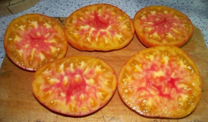 Sunt bicolore,galben-aurii cu roșu,atăt la exterior , cât și la interior, pulpa,fiind în roșu și galben.