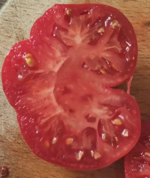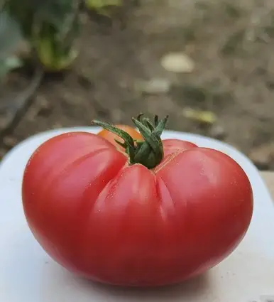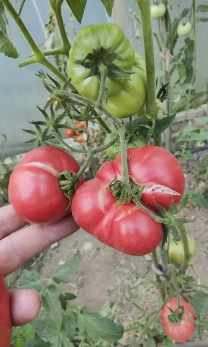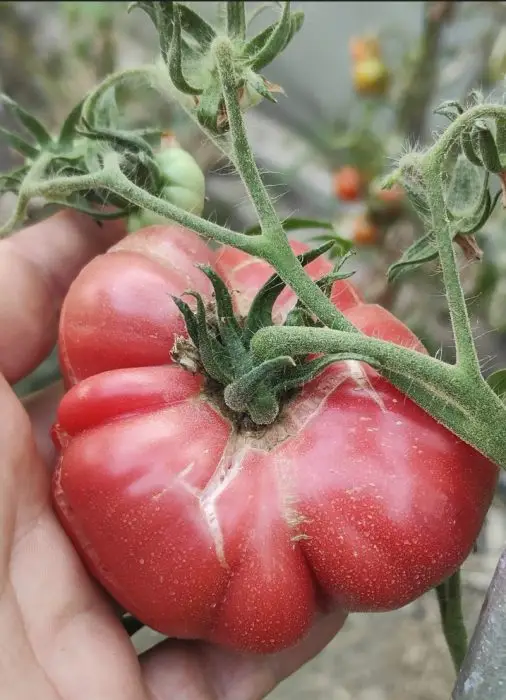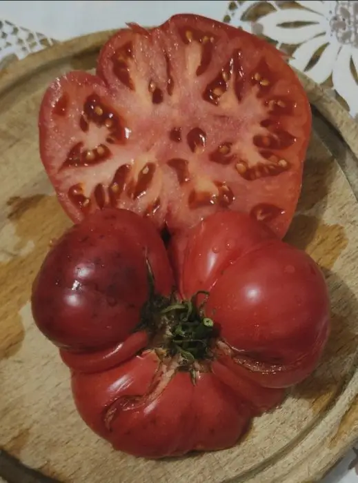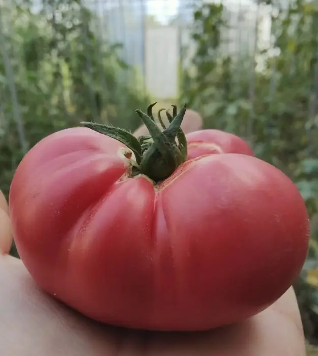 Fructe: Mărimea medie este de 100-250 g, uneori și peste 500 grame , rotund- aplatizate, ondulate, de culoare roz-roșie(„zmeurie”), pulpă fermă, dulce și aromată, oferind un echilibru încântător între dulce și acrișor.